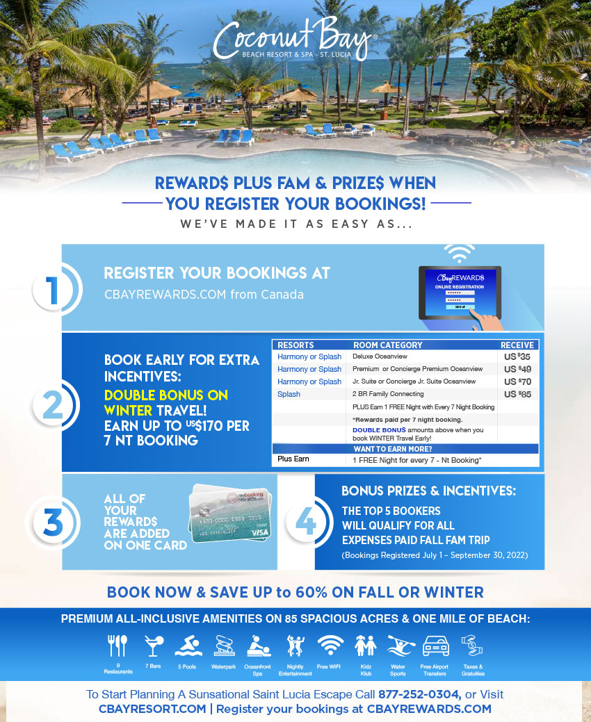 | Up to $85 REWARDS paid for bookings of 7 nights is valid for travel through 12/20/23. ^Double Bonus (up to $170 per 7 night booking) valid for travel 1/3-4/14/23 and bookings registered by July 31, 2022. Reward$ are paid per 7 night stay. Plus Agents also earn one FREE night for every 7-night booking in deluxe oceanview or higher room category. To redeem rewards, bookings must be registered on CBAYREWARDS.COM for Canada agents. Rewards can be redeemed for pre-paid VISA. Complete program terms, restrictions and conditions apply. See website for details. Offer available for a limited time and is subject to change without notice. Rates and discounts vary by dates of travel and length of stay. Some restrictions apply. Top five agents who register their bookings from July 1 – September 30, 2022 will automatically qualify for an all expenses paid FAM trip to Coconut Bay in the fall of 2022. Agents will be notified by email invitation in October 2022. |