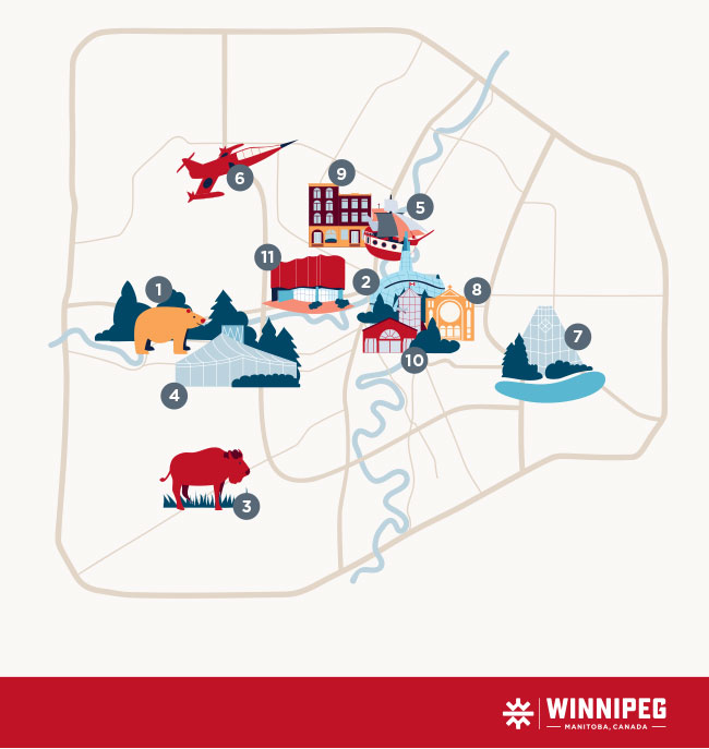 Lorsque vous arriverez à Winnipeg, vous aurez une large variété d’activités à faire, d’attraits touristiques et de quartiers à explorer en plus de gourmandises locales à savourer! Nous avons un zoo où des ours polaires s’amusent à nager au-dessus de vos têtes, la plus grande chute d’eau intérieure au Canada située dans un biome tropical luxueux et une institution d’art qui a été célébrée par les publications les plus estimées du monde entier. Apprenez-en plus à propos de quelques-unes des meilleures attractions de Winnipeg.