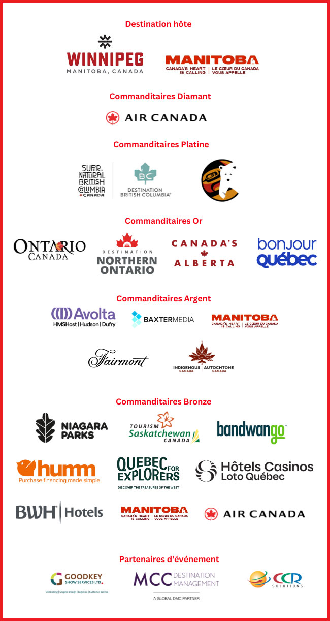 Rendez-vous Canada aimerait remercier les partenaires et commanditaires suivants pour leurs généreuses contributions à Rendez-vous Canada 2025 et leur appui continu envers l’industrie touristique canadienne.