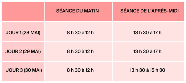 Nos séances du matin commenceront plus tôt à 8 h 30 et notre séance du vendredi après-midi se terminera à 15 h 30. Voir ci-dessous :