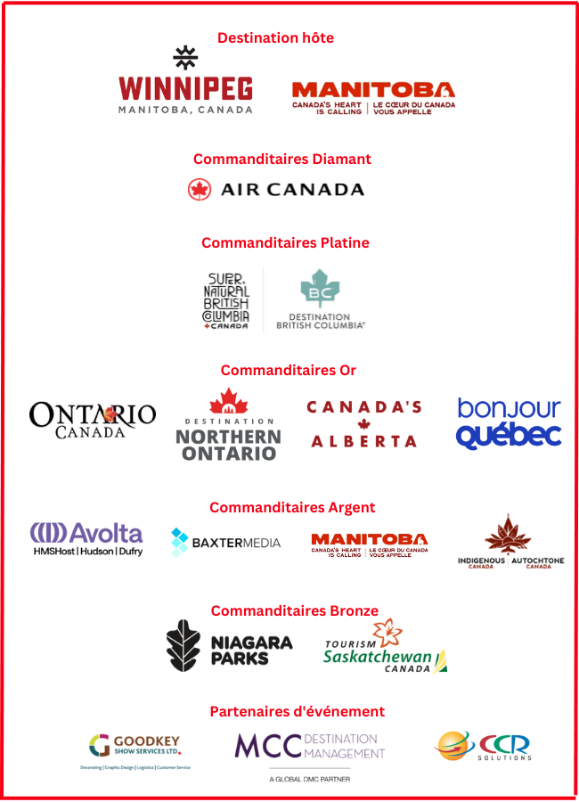 Présentez votre marque lors du plus important marché touristique du Canada. Cliquez ici pour découvrir nos formules de commandites complètes conçues pour maximiser votre visibilité et votre engagement auprès des leaders de l’industrie. Faites vite : la date limite pour profiter d’une occasion de commandite est le 19 mars 2025.