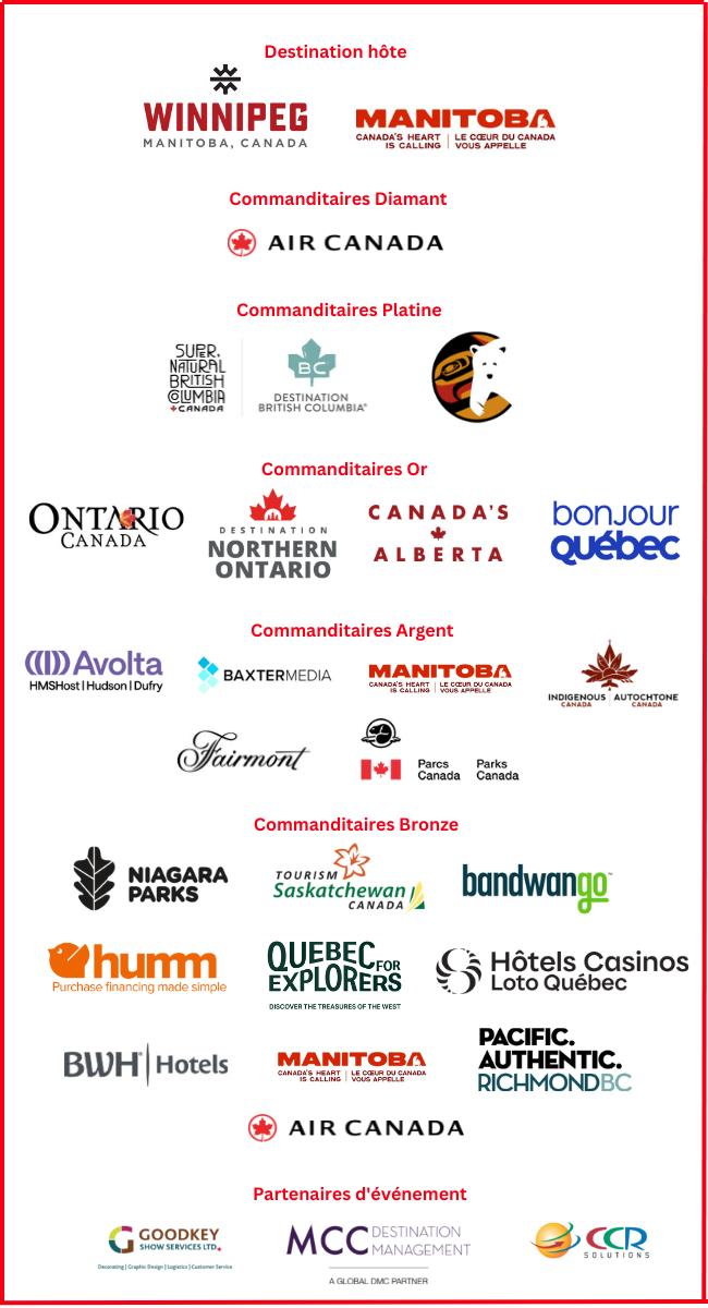 Rendez-vous Canada aimerait remercier les partenaires et commanditaires suivants pour leurs généreuses contributions à Rendez-vous Canada 2025 et leur appui continu envers l’industrie touristique canadienne.