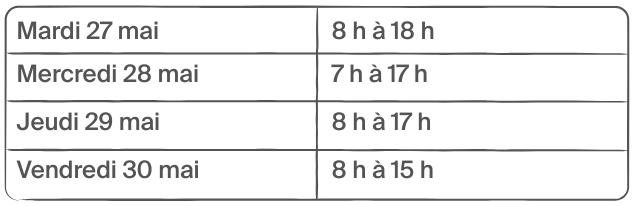 Veuillez consulter l’horaire ci-dessous pour connaître les heures auxquelles l’équipe d’inscription sera disponible pour vous aider. Nos hôtes sur place se tiendront également à votre disposition à ces mêmes heures.