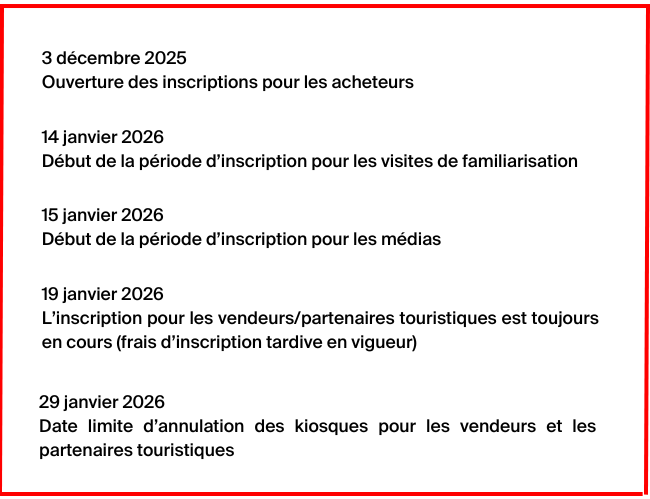 L’hébergement des acheteurs et des médias est inclus dans leur forfait d’inscription. Vous serez informé de votre hôtel à l’approche de l’événement.