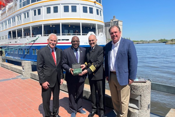 The 202-guest boutique coastal ship, a sister to Ocean Voyager, was greeted in downtown Savannah at River Street Market Landing by city leaders and dignitaries, including Mayor Van R. Johnson, who toured the vessel, visiting with crew and officers before an afternoon guest embarkation.