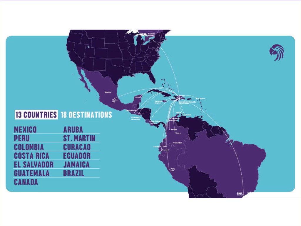 The low-cost Caribbean carrier is turning the Dominican Republic into the new low-price hub of the continent, offering direct flights from Santo Domingo to Mexico City, Cancun, San José, Guatemala, San Salvador, Bogotá, Medellín, Barranquilla, Quito, Guayaquil, Lima, Sao Paulo, Aruba, Curaçao, Sint Marteen, Kingston and 74 connections with the best rates and on new Boeing 737 MAX 8 aircraft that save 14% more fuel than single-aisle aircraft available in the regional market, and reduce the cost by 40%. noise pollution.