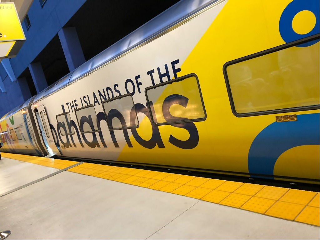 Branded inside and out, The Islands of The Bahamas-themed Brightline train has officially joined the intercity fleet of trains operating between Orlando and Miami with stops in West Palm Beach, Boca Raton, Aventura and Fort Lauderdale along the way.