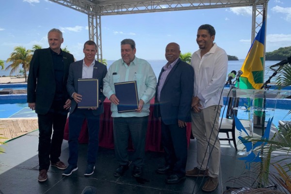 Sandals Resorts International CEO Gebhard Rainer and Deputy Chairman Adam Stewart officiating the expansion of Beaches Resorts into St. Vincent and the Grenadines along with Prime Minister, the Hon Dr. Ralph Everard Gonsalves; Minister of Tourism, Sports, and Culture, the Hon. Cecil O. McKie and Minister of Finance, the Hon. Camillo Gonsalves.