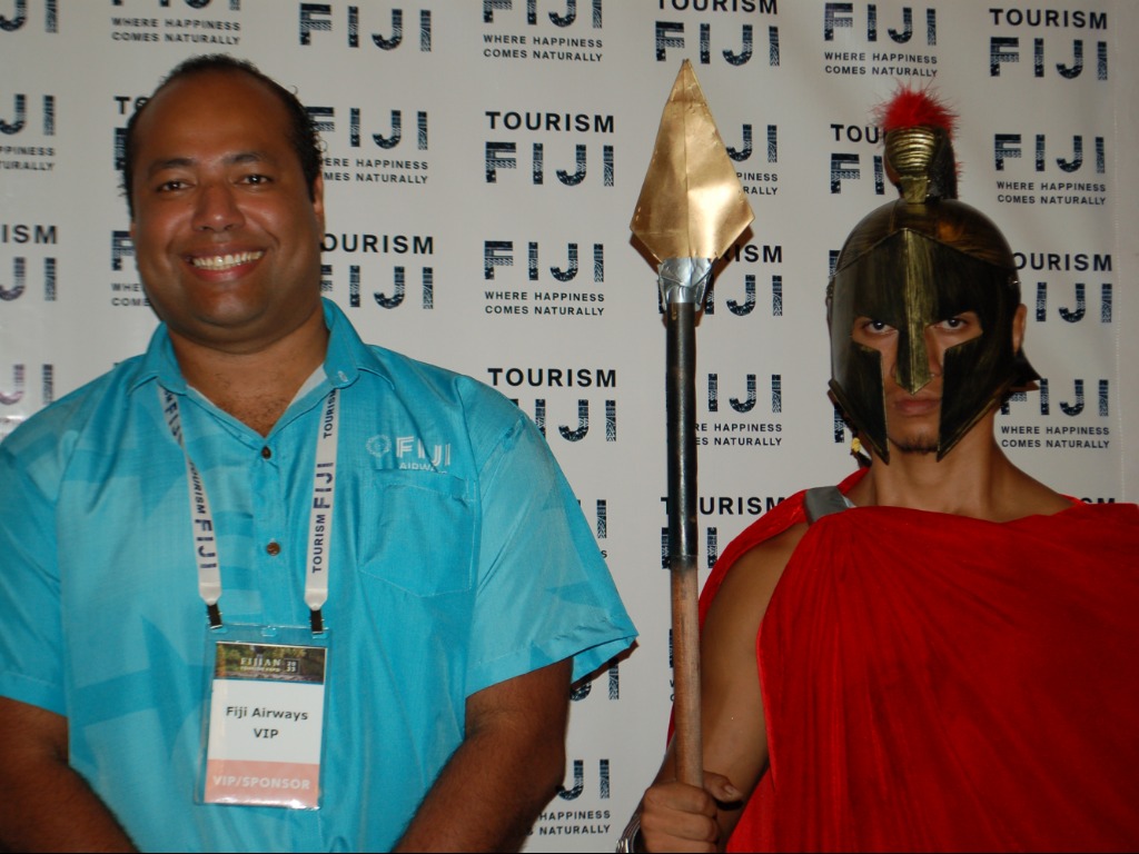 Akuila Batiweti, executive manager global sales, marketing & digital for Fiji Airways posed with a gladiator while promoting the Fiji Spartan Race 2023, the world’s largest obstacle course race.