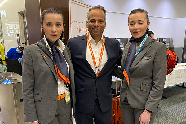 Canada Jetlines’ Director of Sales & Business Development, Sanjay Kopalkar with two members of the flight crew.