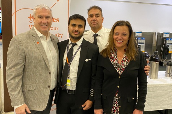 Off and running. Canada Jetlines takes off for Cancun and on its inaugural flight today (March 3, 2023) … Seen here is Canada Jetlines’ Duncan Bureau; Captain Abhay Harigovind; Captain Richard Mrotzek; with Baxter Media’s Wendy McClung.