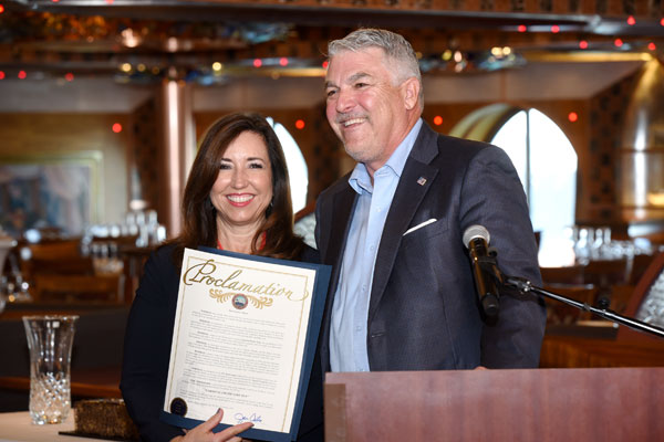 Carnival Cruise Line recently celebrated its 25th anniversary sailing from the Port of Tampa with a reception and luncheon aboard Carnival Legend highlighted by the presentation of a commemorative plaque from Carnival president Christine Duffy to Port Tampa Bay president and CEO Paul Anderson commemorating the milestone.