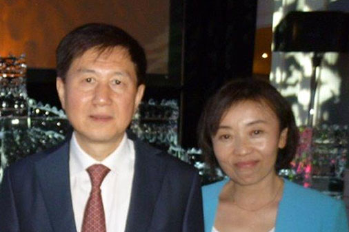 Wang is seen here at the Toronto event with one of his colleagues in front of an ice sculpture recreating part of the Great Wall of China.