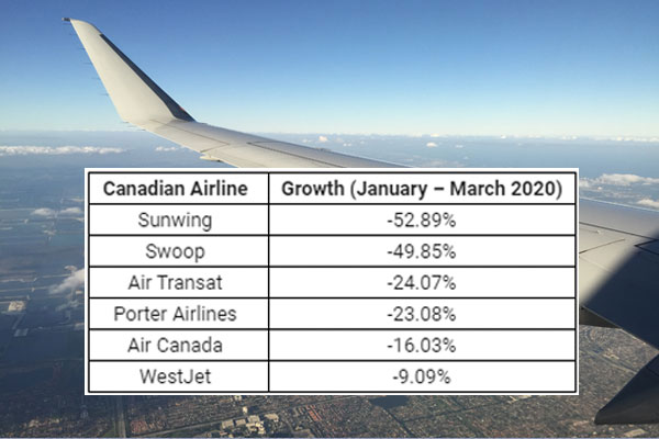 Here in Canada, airlines also took a hit during the January to March period. Sunwing saw 52.9% fewer searches, while Swoop saw searches drop by 49.8%.