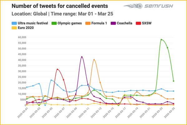 SEMrush also looked at the events industry, which has taken a major blow as a result of COVID-19, with conferences, music festivals, marathons, and major sporting events being shut down or postponed to a later date.