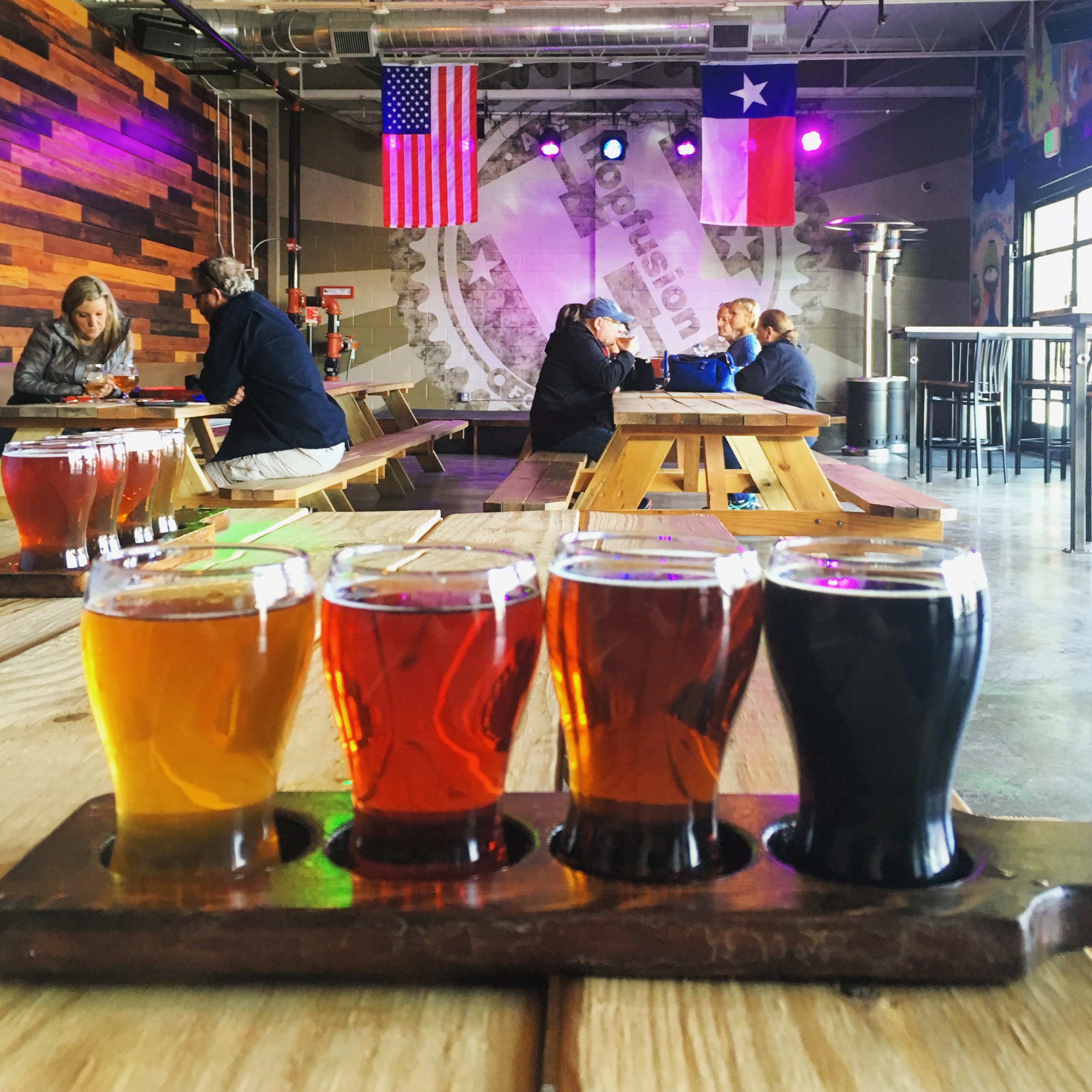 Pictured above: the Air Canada/Texas Tourism FAM group enjoy flights of beer at HopFusion Ale Works.