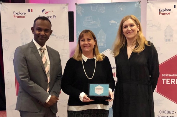 Tudor Alexis, Consul General of France in Toronto and Melanie Paul-Hus, Director, Atout France in Canada present the France Product of the Year to Planet France.