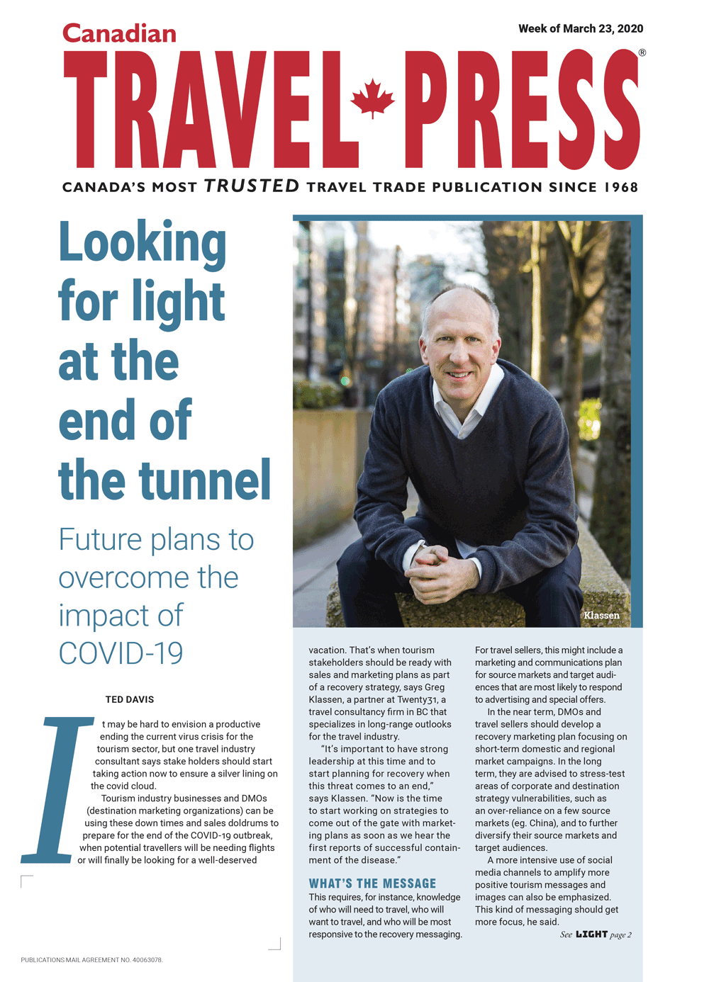 Looking for light at the end of the tunnel Issue Date: Mar 23, 2020 Looking for the light What's the message? 5Q With Tim Morgan COVID-19 – Airline Update Cruise Lines alter course ‹ Staying afloat Stay home, keep dreaming › Posted in Canadian Travel Press