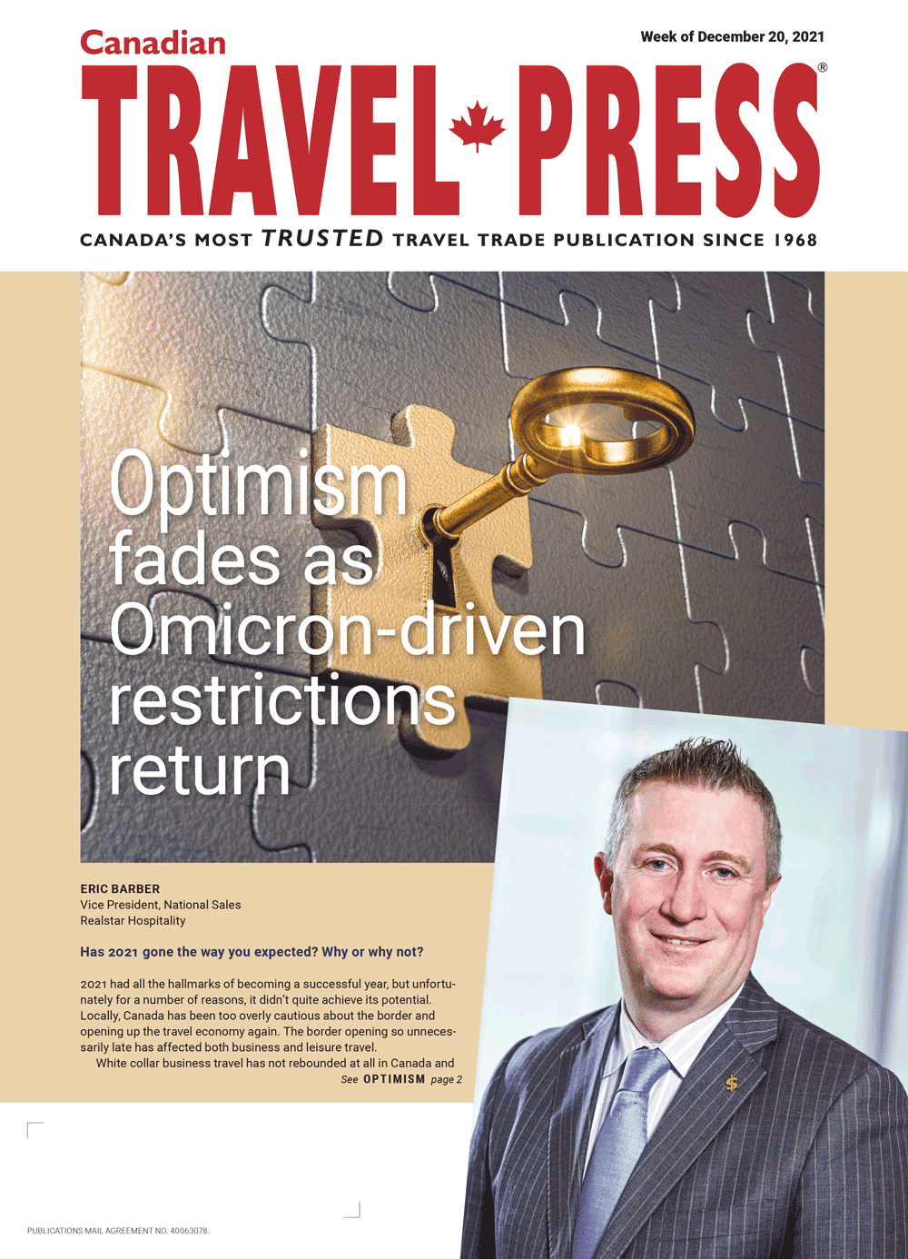 Stay safe. Stay well. We’ll get through this. Issue Date: Dec 20, 2021 Barber – Omicron arrives, restrictions return Guillemette - Be Ready To Respond Rosenberg - The New Distribution Norm Bishop - Turning Challenges To Opportunities Friisdahl – Staying Motivated ‹ Magical moments in Mexico Changing Perceptions › Posted in Canadian Travel Press