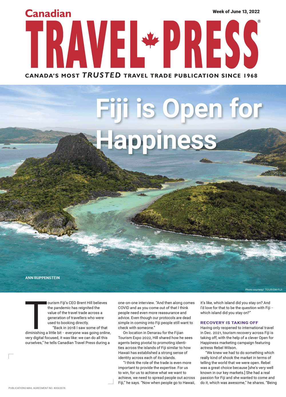 Time For A Little Happiness Issue Date: Jun 13, 2022 Fiji Is Open For Happiness Expanding Horizons For IMPACT Talking To VisitBritain’s Dame Judith Macgregor TraveLaw Takes A Look At Duty Of Care ‹ Are you ready for the recovery Agents’ Choice 2022: It’s All About Support For Travel Advisors › Posted in Canadian Travel Press