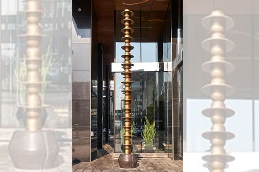 The cast-bronze and cement freestanding pillar is comprised of 33 identical stacked modules. When seen from a distance, the 19-ft.-tall sculpture displays balance, lightness and rhythm through its repeated geometric shapes, reminiscent of Constantin Brancusi’s “Endless Column,” which is considered to be one of the 20th century’s great modernist abstract monuments.
