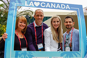 Some of those attending the Canada suppliers reception at IPW were (l-r) Diane Zeppieri of the Avis Budget Group, Corey Marshall of Travel Oregon, Bronwen Ray of WestJet Vacations, and Dave Cecco of WestJet Vacations.