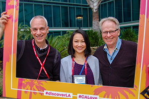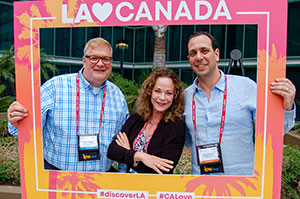 Canadian product buyers and media gathered on the pool deck of the Anaheim Hilton on the evening of the first day of IPW 2019 in Anaheim for a special Canada reception to meet some U.S. suppliers. Amongst those attending were (l-r) Mark Sniderman, mgr. tourism and global partnerships for Air Canada; Tamy Martelli, U.S. and Canada regional director for the Los Angeles Tourism & Convention Bureau; and David McClung, president of Baxter Media.
