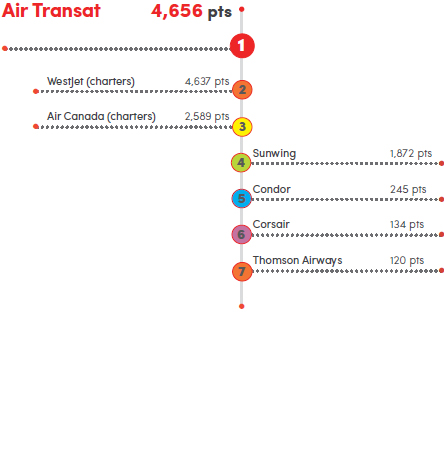 | In our 2017 poll, Air Transat was picked as the favourite by travel agents, a spot it has held since the leisure airline category was introduced in 2015. Not surprisingly – well, it is the airline business, isn’t it – competition in the category has always been tough, and things were no different this year. Along with topping the national results, Air Transat was the favourite in both Ontario and Quebec, while WestJet was the favourite in Western Canada and Air Canada was picked by agents as their favourite in Atlantic Canada. | ![]() |