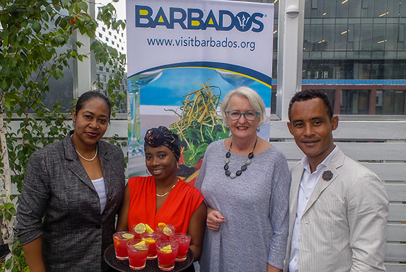 (Photo above: On hand at a Toronto event promoting Barbados were Stacey Hutchinson of Barbados Tourism Marketing, a server offering rum punches, Ethel Hansen Davey of Uniglobe and Dave Cox of Living Barbados magazine.)