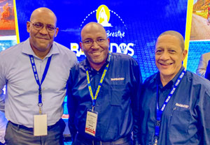 On the trade show floor are Barbados’ Minister of Tourism and International Transport, Kerrie Symmonds, with Peter Mayers and William Griffith of Barbados Tourism Marketing Inc.