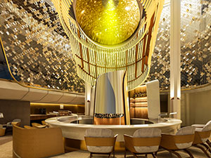 Guests are sure to be drawn to the space by The Chandelier, a striking lighting feature – and art installation – that rises over the Martini Bar to the ceiling three decks above. Composed of five levels of 765 blades illuminated by dynamic LED strips that change colour from day to night, The Chandelier weighs in at seven tons.
