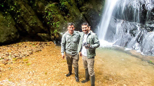 (Photo above: Mashpi Lodge’s Klever Merino (l) and Nestor Paladines stand before an area waterfall.)