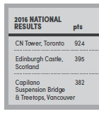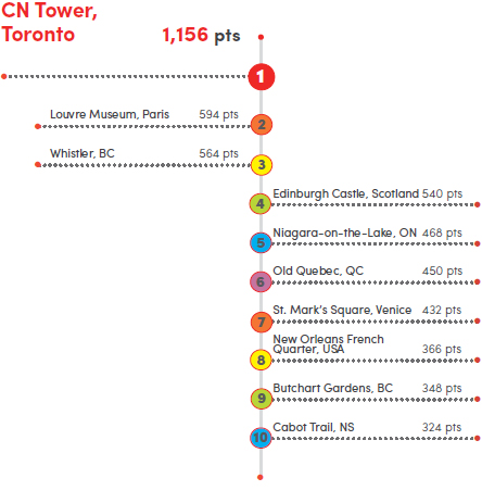 | CN Tower continued as this year’s favourite attraction. The Louvre in Paris moved up two spots to second place; Whistler, BC, jumped four spots to third; and Old Quebec was up three spots to sixth place. |