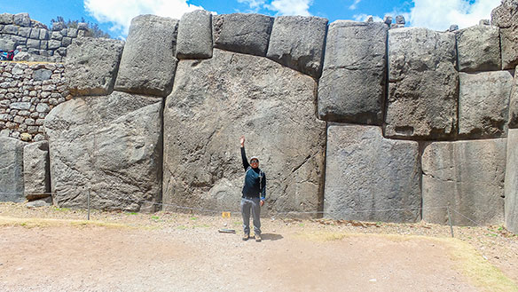 (Pictured above: explora Valle Sagrado guide Angel Layme stands before a massive boulder that forms part of a wall at the Inca complex of Sacsayhuaman in Cusco.)