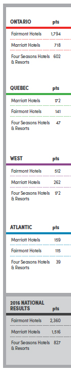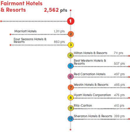 | In the non-all-inclusive hotel category, Fairmont continues to be the favourite of Canadian travel agents. Along with finishing first in the national polling, Fairmont was also the regional favourite of agents in Ontario and the West. Regionally, Marriott Hotels – which finished in second spot – was the favourite of agents in Quebec and Atlantic Canada. | ![]() |