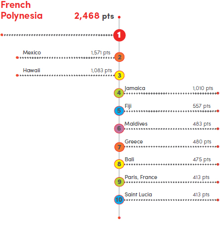 | In 2017, agents picked French Polynesia as their favourite honeymoon destination for the third year in a row. Along with being the national favourite, it was also the favourite in Ontario and Atlantic Canada. Mexico was the regional favourite in Quebec and the West. Of note: A number of new destinations broke into the top 10 in our 2017 poll with Paris, France, jumping from 17th to ninth and Greece moving from 13th to seventh place. | ![]() |