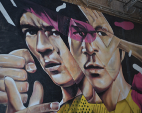 A painting of Bruce Lee is amongst the graffiti art that gets wall space in some of the narrow alleys that cross through SoHo, near Hollywood Road.