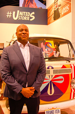 Colin Skerritt, the new Canada regional director for Brand USA, at IPW with one of the United Stories vehicles.