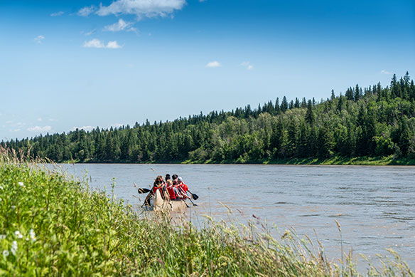 Paddle Into the Past has participants travel 5 kilometers on excursions of around four hours on the North Saskatchewan River in 22-foot-long canoes that hold eight people and recall the massive canoes the voyageurs – who were frequently Metis – used as they paddled and portaged across much of what is now Canada centuries ago as part of the fur trade.