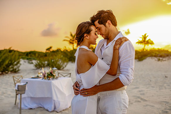 Elemental Luxury: Take your celebration to the next level with Elemental Luxury, including upgraded elements curated by Karen Bussen. A tropical oasis in the middle of a white-sand paradise. Earthy, fresh and lush, this chic design combines an elegant beach wedding with layers of tropical foliage, organic elements and earthy textures.