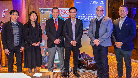 (Photo above: A recent Singapore Airlines event in Vancouver debut the carrier’s new Singapore-Seattle flight service to the travel trade. Hosting the event were (l-r) Adrian Ee, VP for Singapore Airlines (SIA) in the eastern USA; Magdeline Zee, passenger development mgr. for Changi Airport in Singapore; Les Kovacs, SIA sales mgr. for Canada; Tim Lee, SIA VP for the western USA; Michael Wraight, the SIA sales mgr. leisure for the USA; and Ambrose Tham, MICE specialist for the Singapore Exhibition & Convention Bureau.)