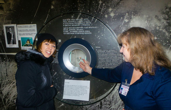 Tourist guide Anastasia Lazo (l) and a guide in Kyiv’s Microminiatures Museum point to one of the museum’s exhibits.
