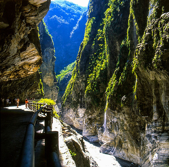 Vehicles of all sorts eventually stop at a check point, where passengers disembark and collect safety helmets, presumably to protect against any rock falls. They then walk further on the road along the edge of the gorge to marvel at the sheer canyon walls and shoot photos. Their transport awaits at the end of this scenic stroll. With Pacific Ocean waves pounding the beaches just a short drive away, it is a spectacular way to start altering perceptions of Taiwan.