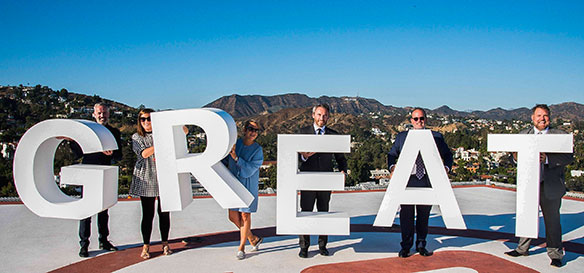 (Pictured above: The 9th Destination Britain North America trade fair hosted 170 participants at the Loews Hollywood Hotel. Pictured on the roof of the property are VisitBritain team members (l-right) Carl Walsh, travel trade director, Americas; Emma Wilkinson, interim marketing and communications director, Americas; Carol Dray, commercial director; Michael Howells, Britain’s Consul General to the southwest US; Gavin Landry executive VP, Americas; and Paul Gauger, senior VP, Americas.)
