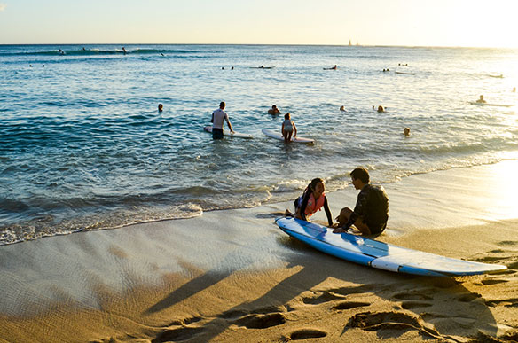 But in the end, all the new glitz and glamour of present- day Waikiki would be nowhere without the iconic beach that started it all. Waikiki Beach is still a perfectly shaped crescent composed of silky white sand, washed with rustling waves that are ideally shaped for novice surfers – and with that unmistakable backdrop of Diamond Head mountain.