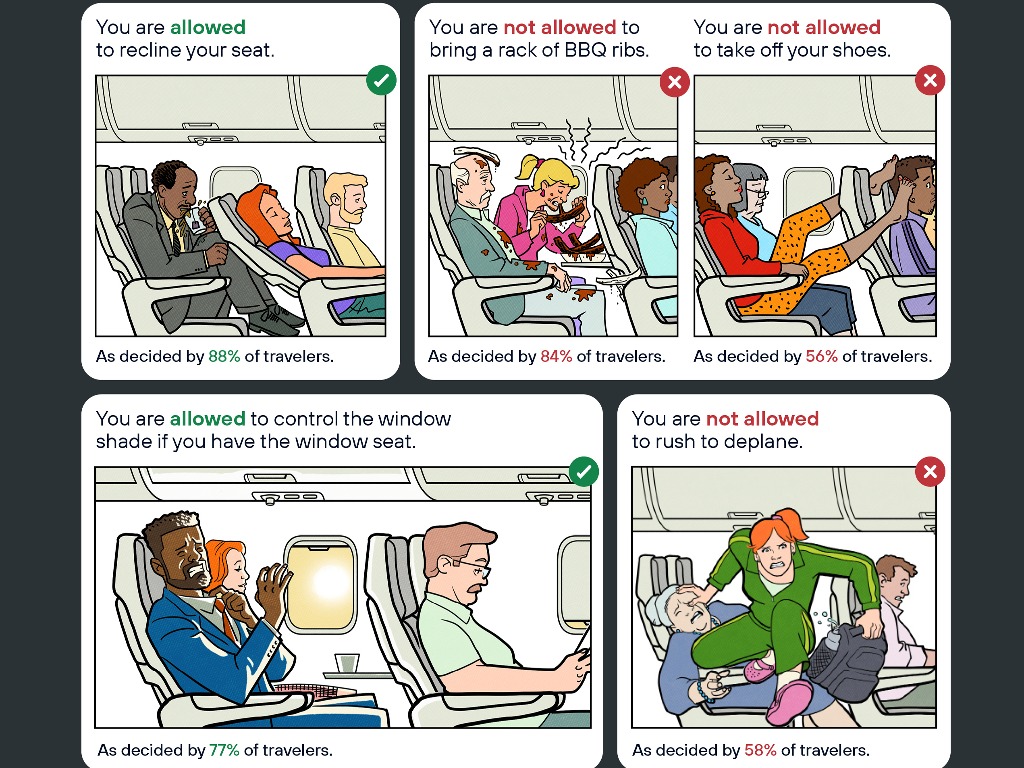 These comprehensive rules address a wide array of topics, ranging from whether it is acceptable to put your feet on the chair in front of you (68% agree it’s not), to the food you should never bring on a flight (spoiler alert: it’s hard-boiled eggs, according to 74% of travellers).