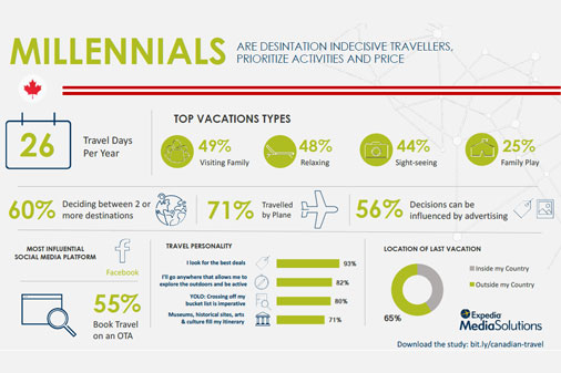 Most Canadian travellers are deciding between two or more destinations when planning a vacation, and visiting family, relaxing at the beach or on a cruise, and sight-seeing are the most popular trip types. Value is of the utmost importance to all generations, and deals help guide their decision-making process. More than 90% of all generations said they look for deals before making a decision, and more than 50% said ads can be influential in their planning process.