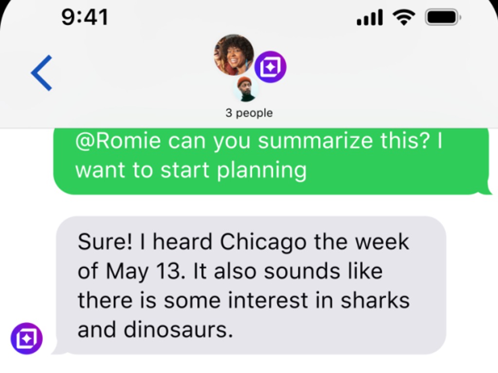 Intelligent Assistance: Throughout your trip, Romie updates your itinerary in real time so anyone in the group chat with FOMO can see what you’re up to, and anyone that needs to pick you up from the airport can simply @Romie to check what time you land.