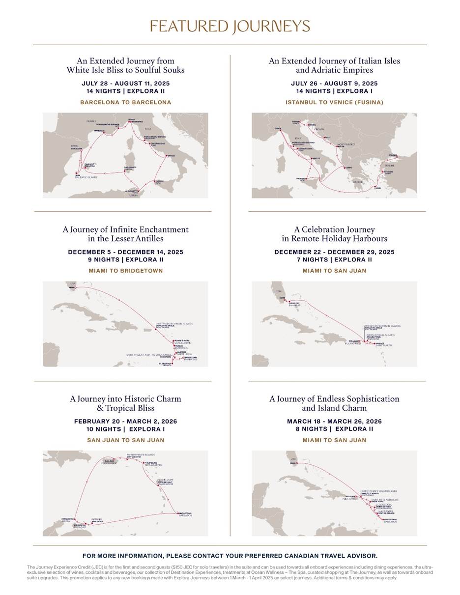 Canadians that reserve a journey by April 1, 2025 will receive an additional $300 Journey Experience Credit per suite*. Combinable with select offers.