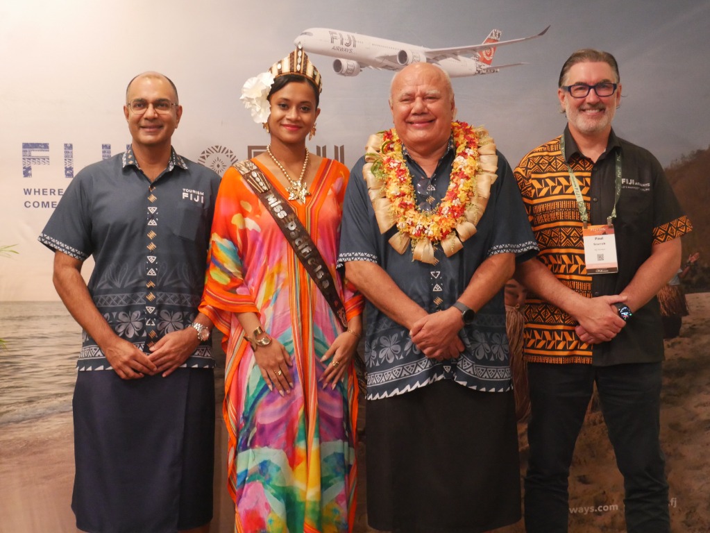 Seen here from l to r, are Dr Paresh Pant, Tourism Fiji; Ailava Samuels, Miss Pacific Islands 2026; Viliame Gavoka, deputy prime minister and minister of tourism and civil aviation of Fiji & Paul Scurrah, Fiji Airways.